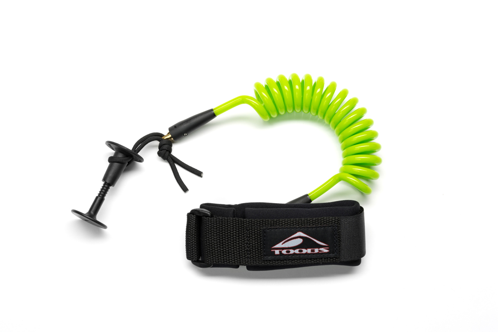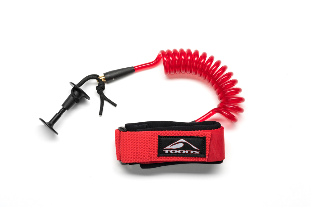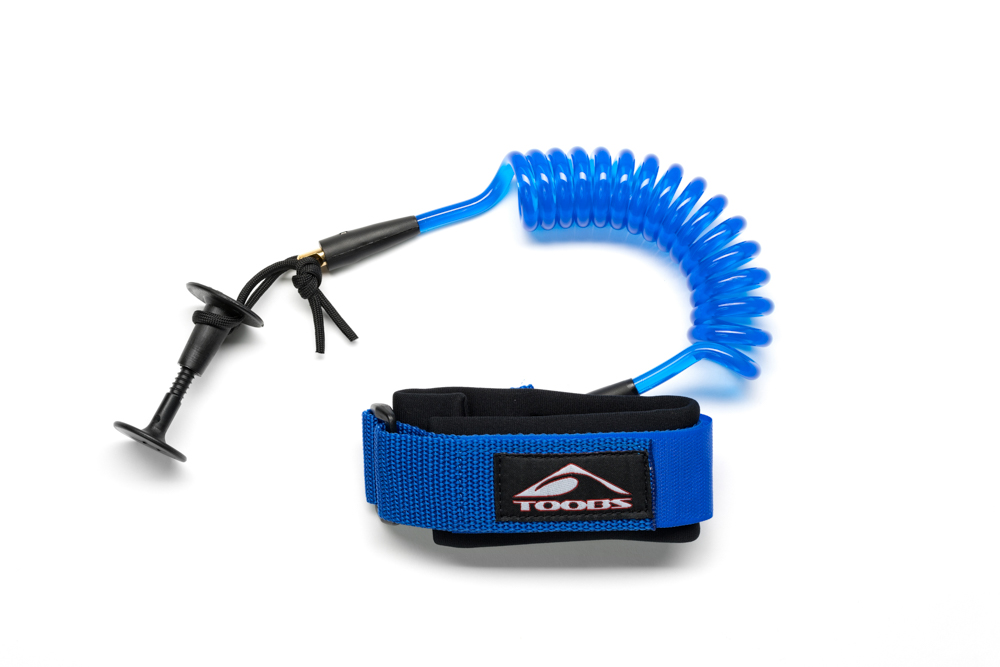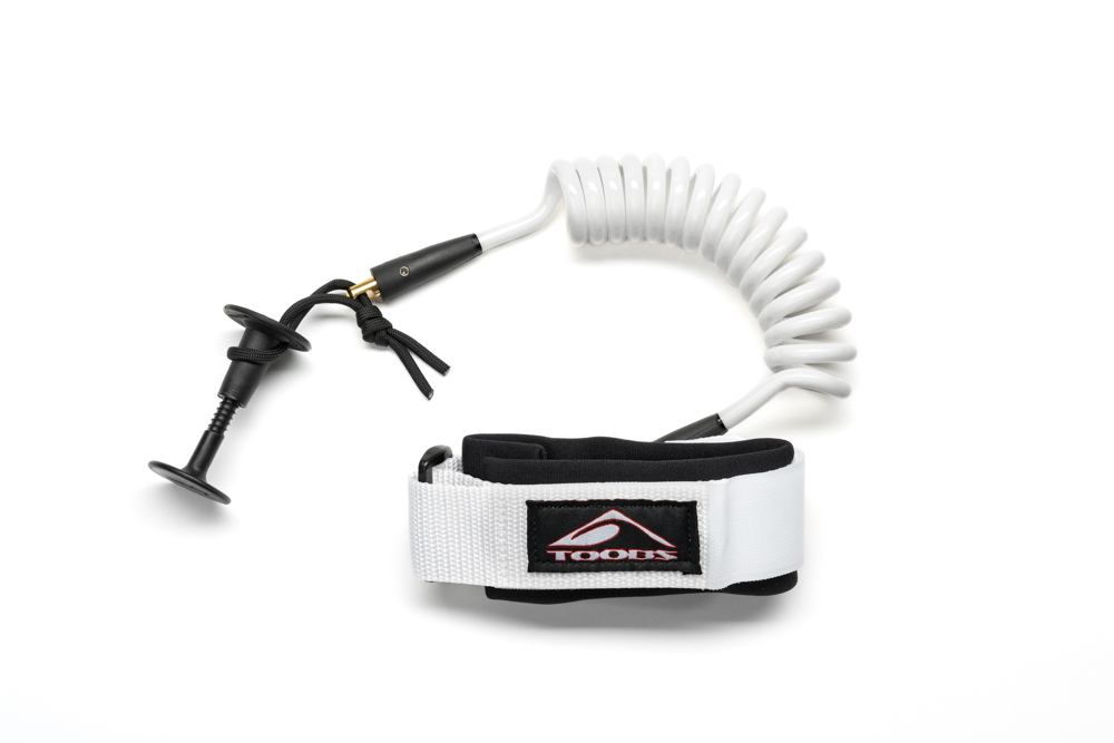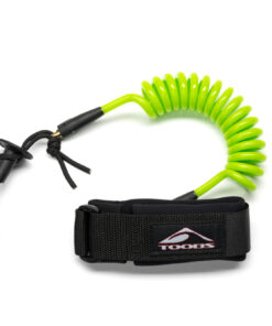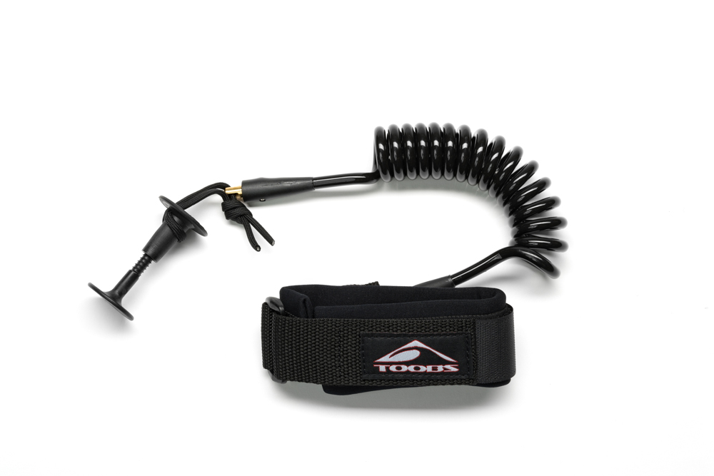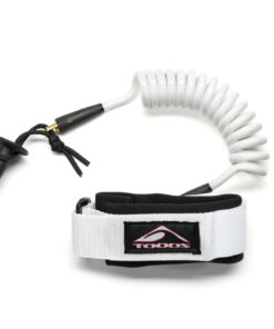 This durable coil leash for the bicep is 4.5′ in length (fully stretched) and made of urethane. It comes with molded ends, stand-away padded neoprene cuff with adjustable buckle, and flathead anchor.